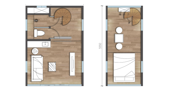 - Размеры: 1-й этаж (L) 5.55 x (W) 4.05 x(H) 2.55 2-й этаж (L) 5.55 x (W) 2.9 x (H) 2.55