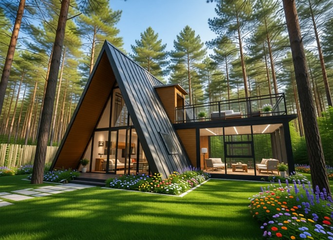 Дом А-фрейм из металлического каркаса — это каркасное строение в форме буквы «А», где двускатная крыша заменяет стены, доходя почти до фундамента. Такие дома привлекают внимание оригинальным дизайном, быстротой возведения и возможностью создания уникального интерьера.