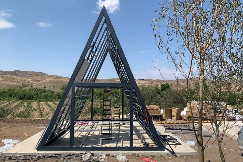 Модульный мобильный дом типа A-FRAME представляет собой инновационную концепцию мобильного жилого помещения треугольного типа, которая состоит из металлического целостного каркаса, выполненного из черной стали и обработанного горячим цинкованием (для защиты от эрозии), покрашенной декоративным лакокрасочным покрытием, со встроенной инженерной системой (вода, канализация и электричество) , с нормальными панелями теплоизоляции по стенам, потолку и полу не менее 100 мм, позволяющей при должной эксплуатации выдерживать температурные и климатические условия средней полосы России.